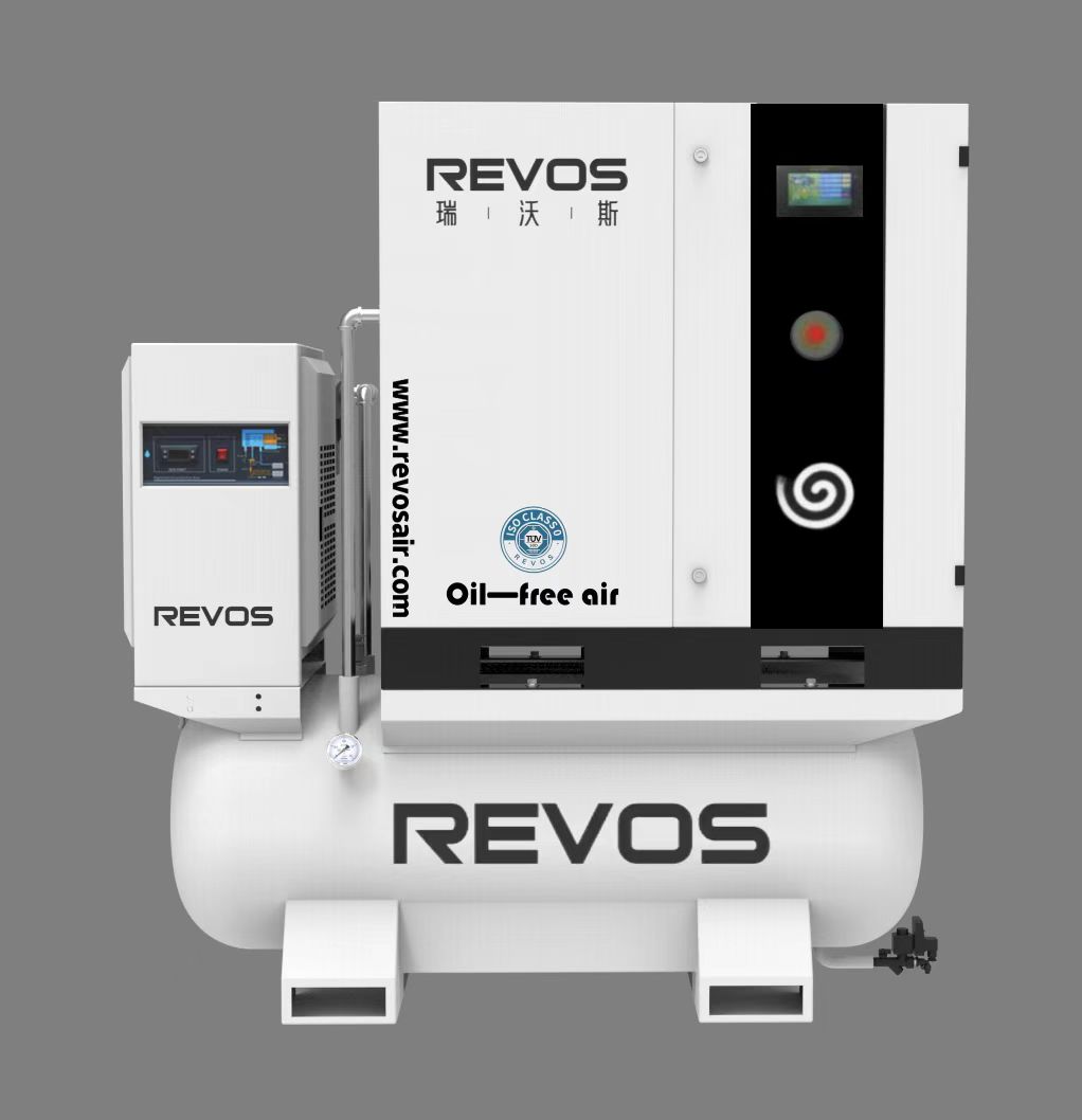 An oil-free scroll air compressor integrating an aircompressor main unit, a refrigerated dryer, aprecisionfilter, an automatic drain and an air storage tank.